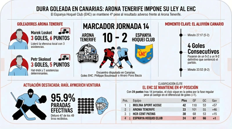 El Espanya Hoquei Club de Palma sufrió una contundente derrota por 10-2 ante el Arona Tenerife Guanches Hockey en un partido correspondiente a la jornada 14 de la liga regular. Desde los primeros compases, el equipo local demostró una superioridad ofensiva que EHC no pudo contrarrestar, Arona pegó primero y no soltó el acelerador, sellando un resultado abultado que refleja la diferencia vista sobre la pista.